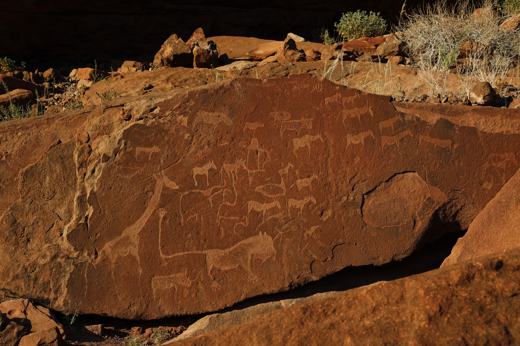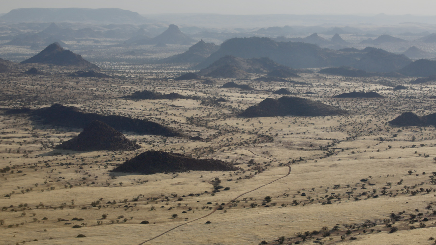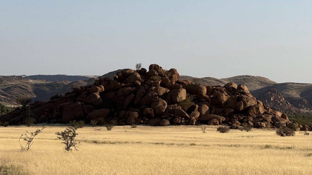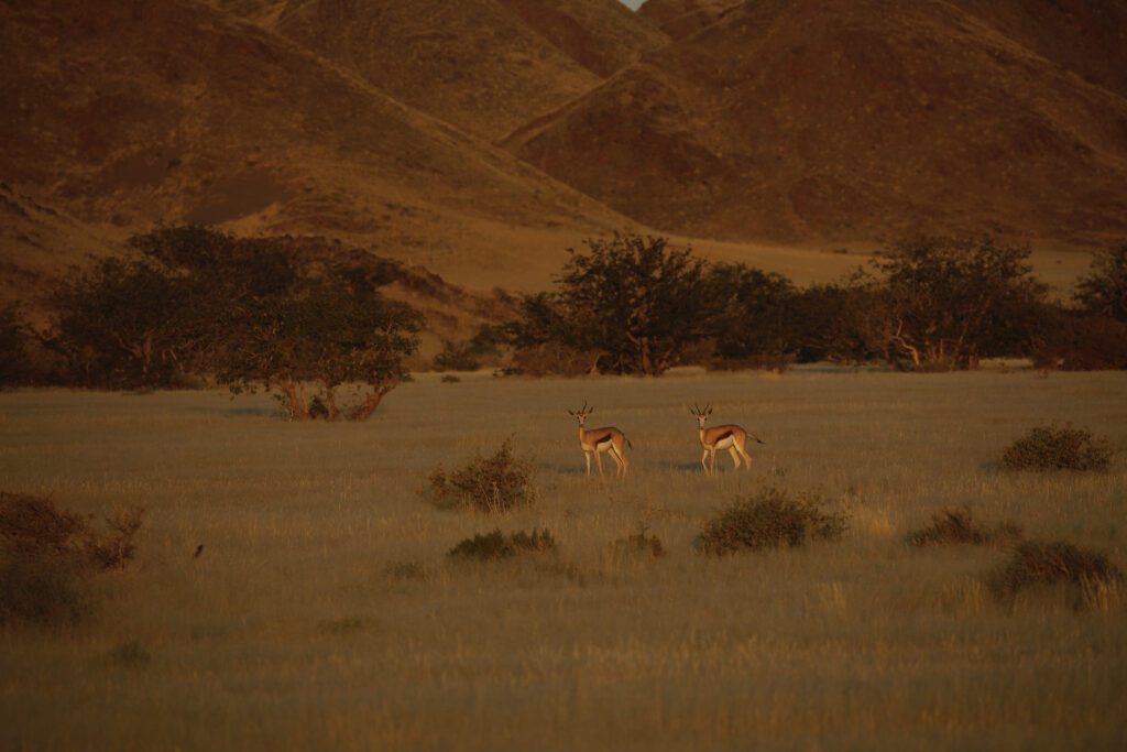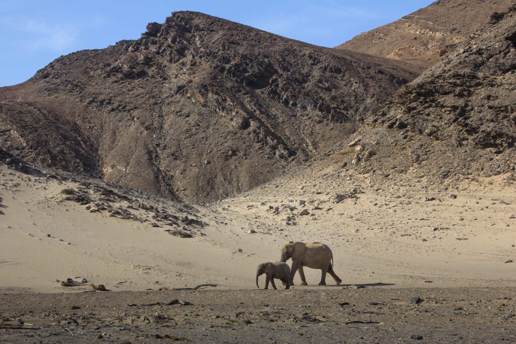 The landscape consists of rugged folded hills, plains and wooded river valleys in a largely semi-desert and sparse savannah. Boasting some of the most magnificent views of Namibia’s highest mountain, the Brandberg, and the typical cathedral-like granite inselbergs of Damaraland, Onduli Enclave is within striking distance of other geological attractions such as the Burnt Mountain, Organ Pipes and Doros Crater. Named after the Doros Crater, Doro !Nawas means ‘the place where rhinos roam’ in the Khoekhoegowab language, and the area is home desert-adapted black rhino, elephant, giraffe and general plains game and predators such as cheetah, leopard, lion, spotted and brown hyena.