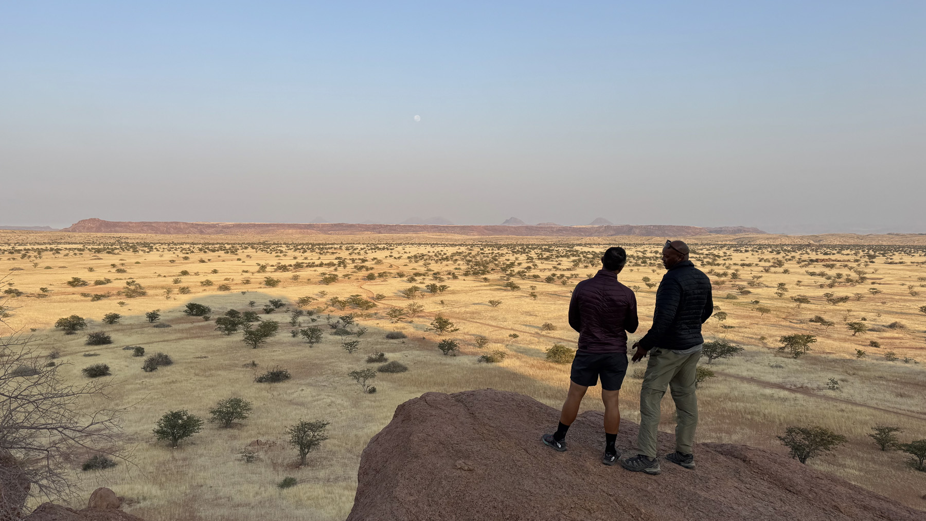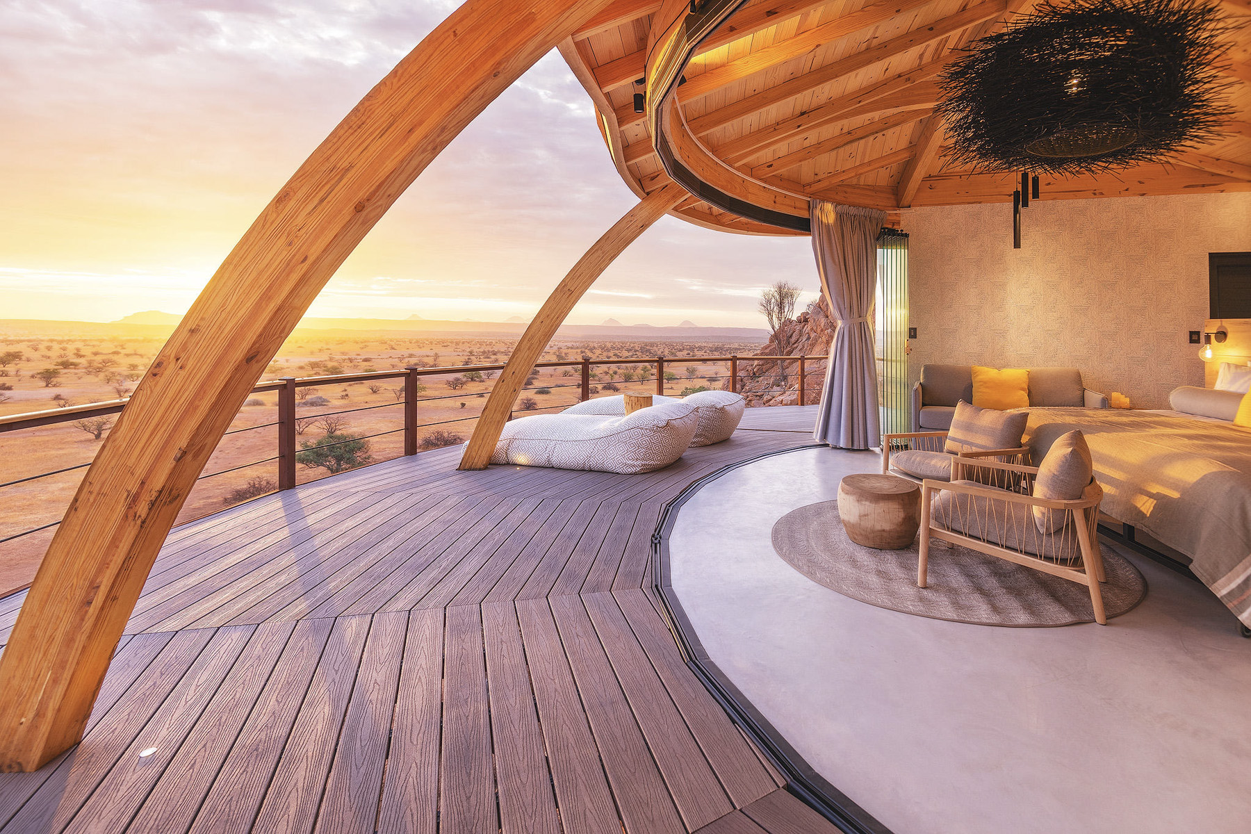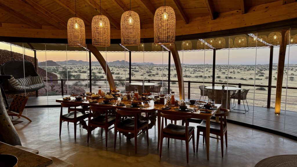 Onduli Enclave, the private villa addition to Onduli Ridge, is built high up against a south-facing granite outcrop affording magnificent views of the Brandberg, Namibia's highest mountain to the south, the dispersed cathedral-like granite inselbergs to the southeast, and the Doros Crater to the west.