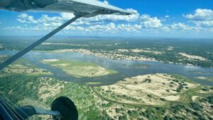 As you leave Lusaka and head south over the miombo woodland, the land rises gently, becoming more mountainous and begins to feel increasingly wild. You usually clear the crest of the escarpment at a fairly low altitude, which makes the sudden reveal of the mighty river all the more startling. It is one of our favorite views anywhere in Africa – jaw-droppingly beautiful, varied, and layered.