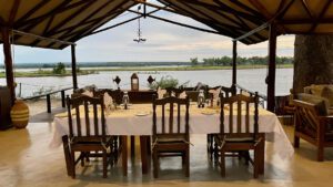 We stayed at Mpala Jena, arriving by boat—roaring up gentle but powerful rapids at about 20 knots, pausing to watch two bull elephants swimming and tussling mid-river. Mpala Jena feels light and airy, with relaxed, beach-like vibes that work beautifully on the banks of the river. The food was good, and the staff were amazing.